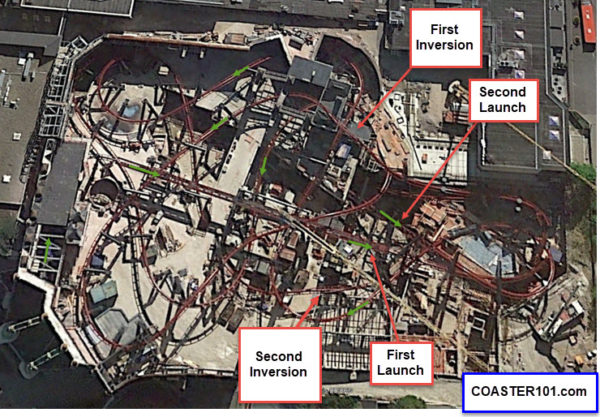 No stats are available but the parks claims F.L.Y. is the world’s longest flying roller coaster which would make it longer than Flying Dinosaur at Universal Studios Japan, or more than 3,687 feet long. There are two launches and two inversions included in the tangled mess of track. Try to unscramble the layout of F.L.Y. in the aerial image below: